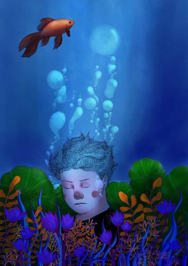 Le repli illustre ce doux moment, où lorsque tout nous est hostile, nous prenons le temps de se réfugier dans notre bulle, dans notre océan intérieur !