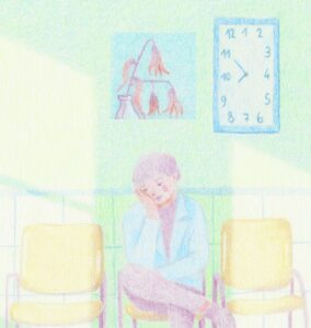 L’inertie intérieure est cette sensation diffuse où le temps se fige, et où l’air devient lourd, suspendant le mouvement. Le corps, prisonnier d’une invisible gravité, observe le monde, continuer sa course, incapable de le rejoindre. C’est un silence habité, une parenthèse ou le moindre geste demande une énergie monumentale, comme pour s’arracher à un songe. Une réalité souvent invisible que j’ai voulu mettre en couleur dans cette illustration.