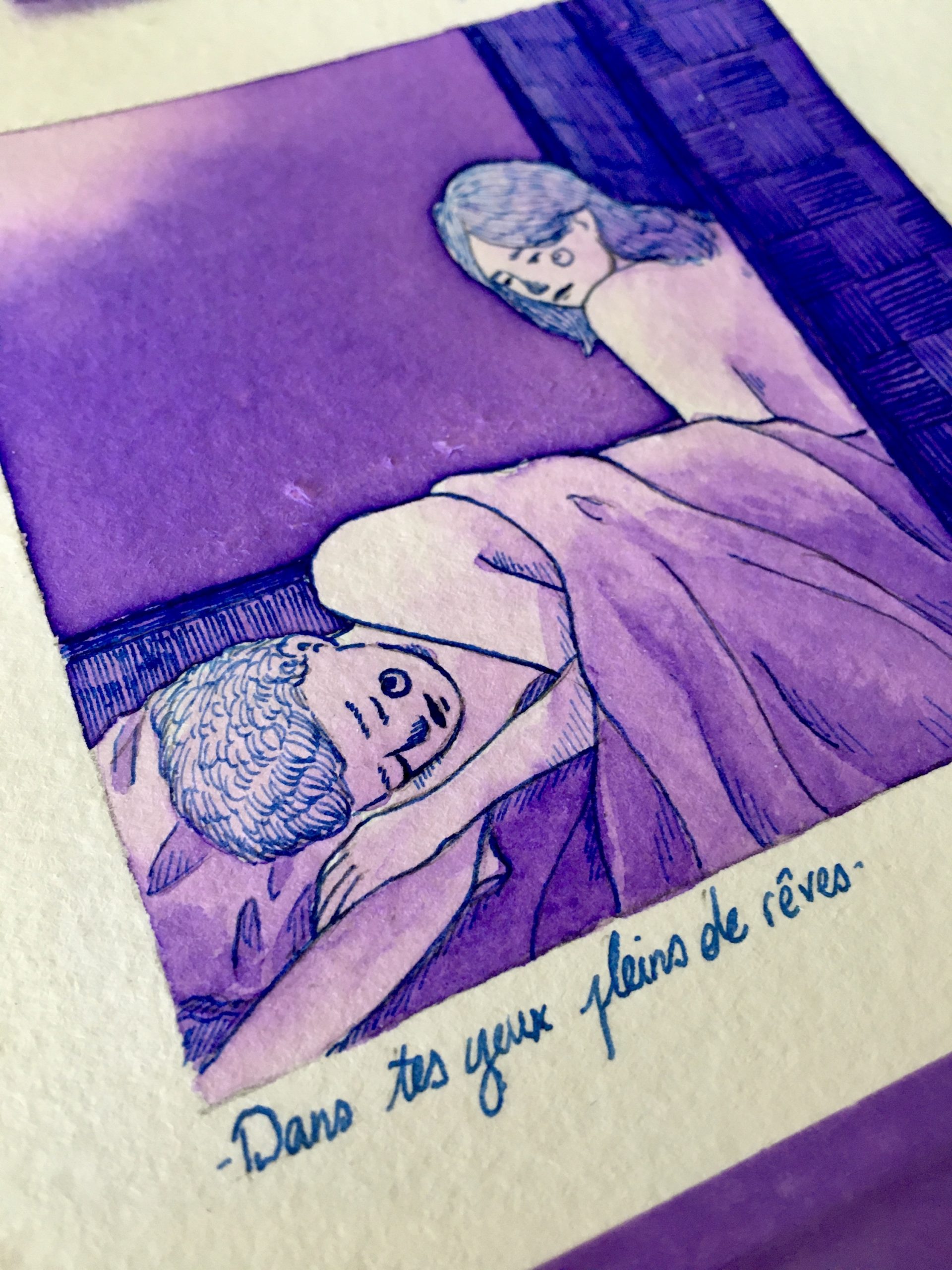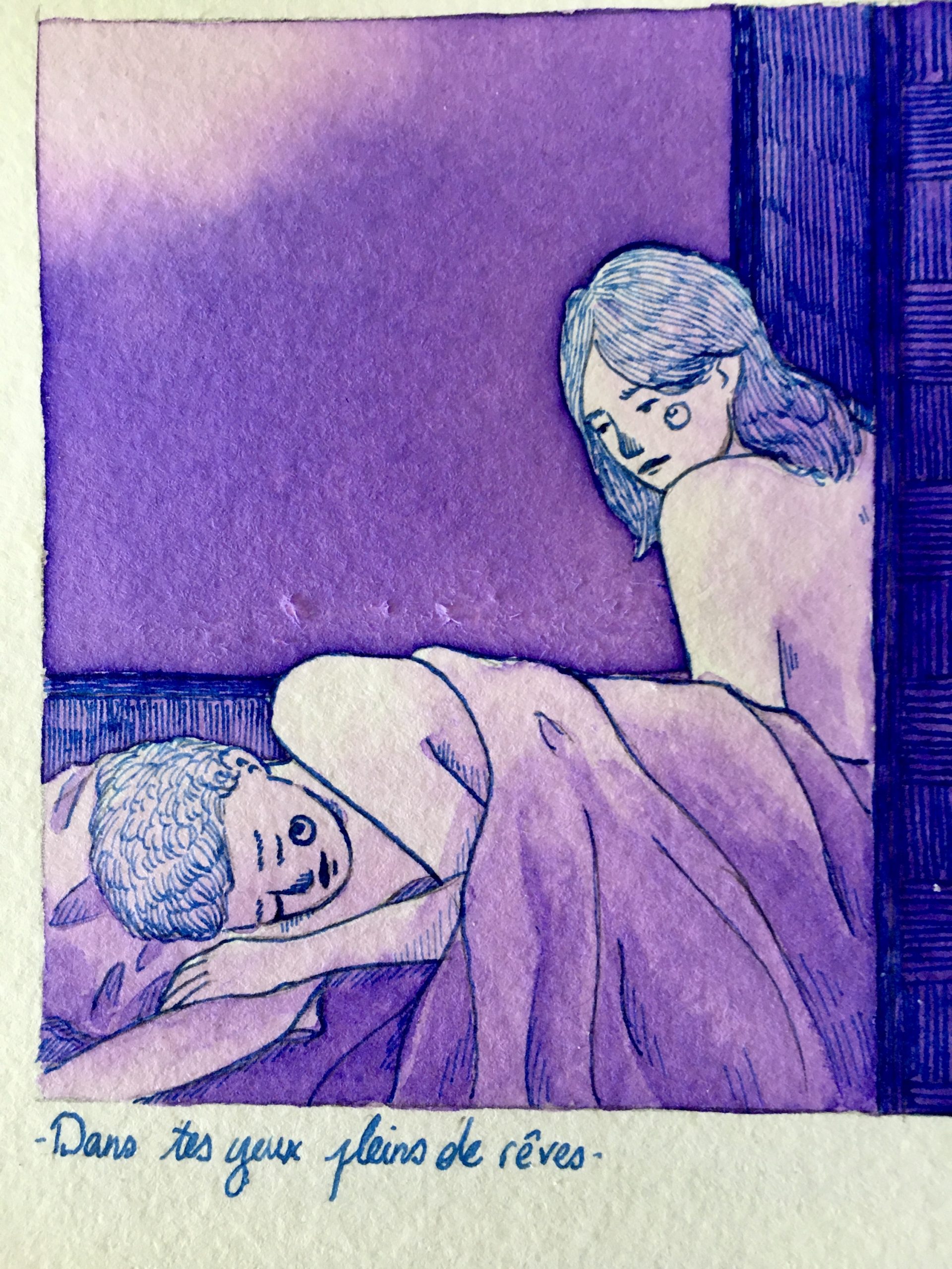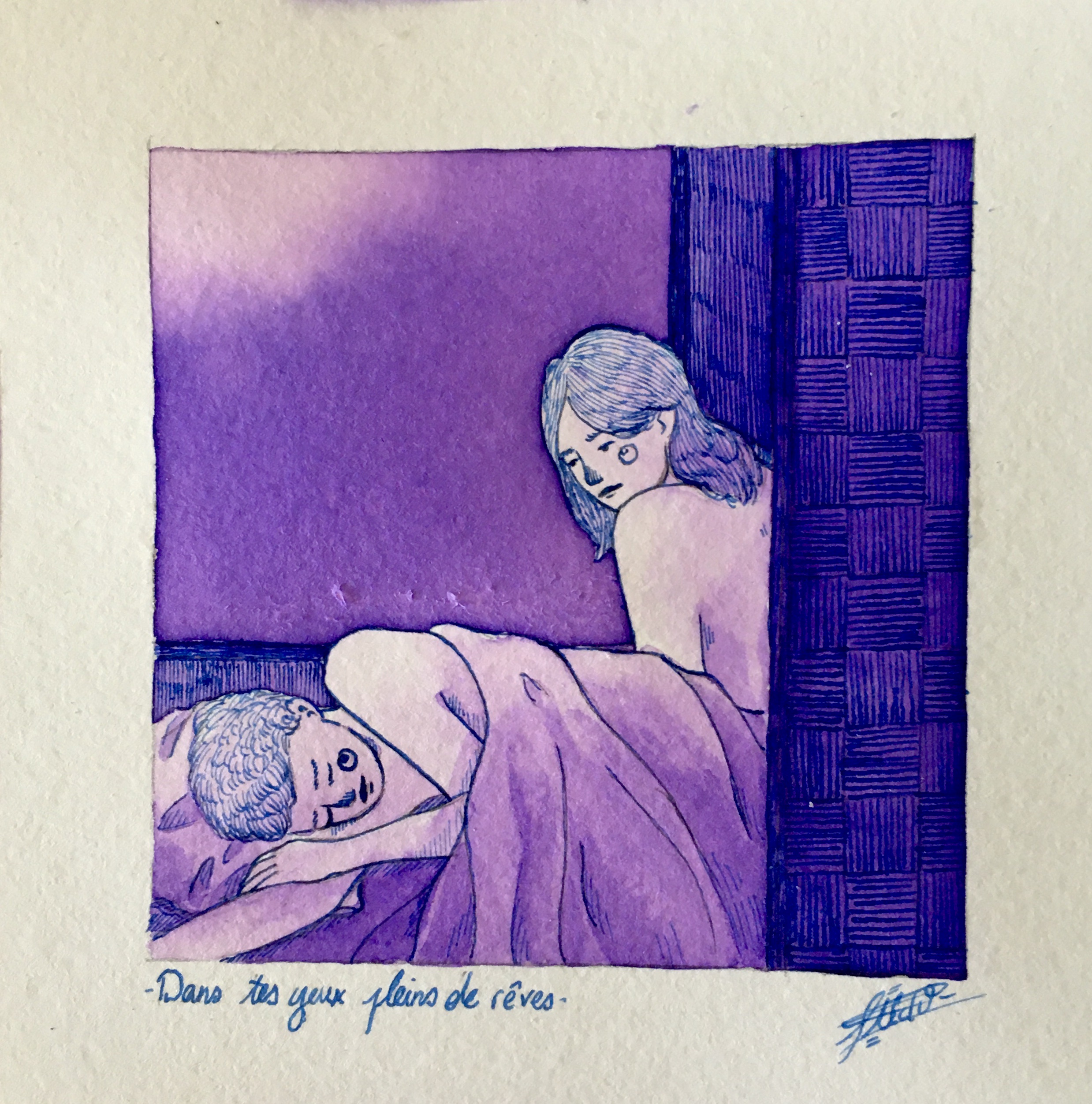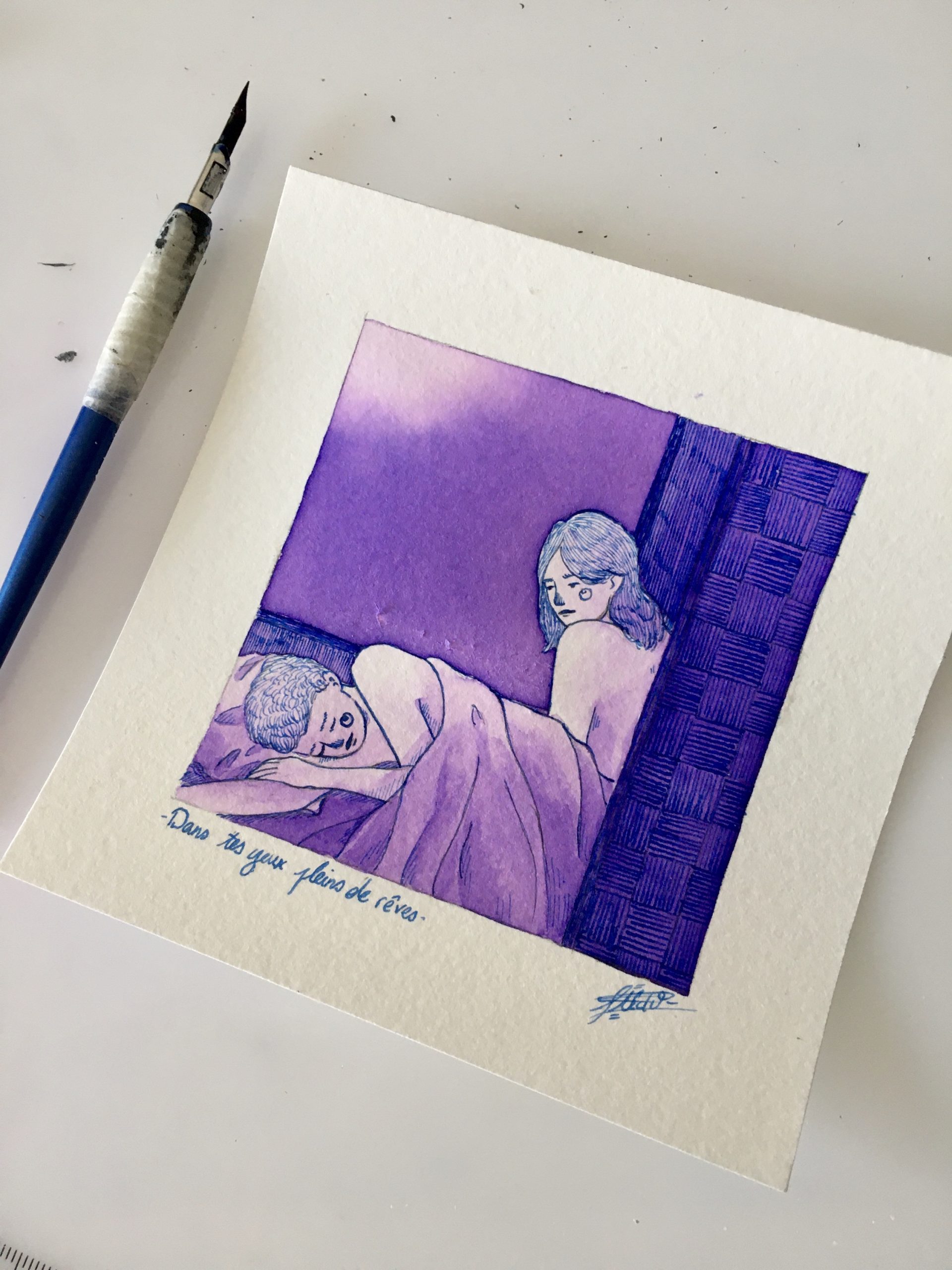 Dans tes yeux pleins de rêves est une Illustration originale à l’aquarelle liquide et l’encre bleue sur du papier aquarelle 310g/m2 .
