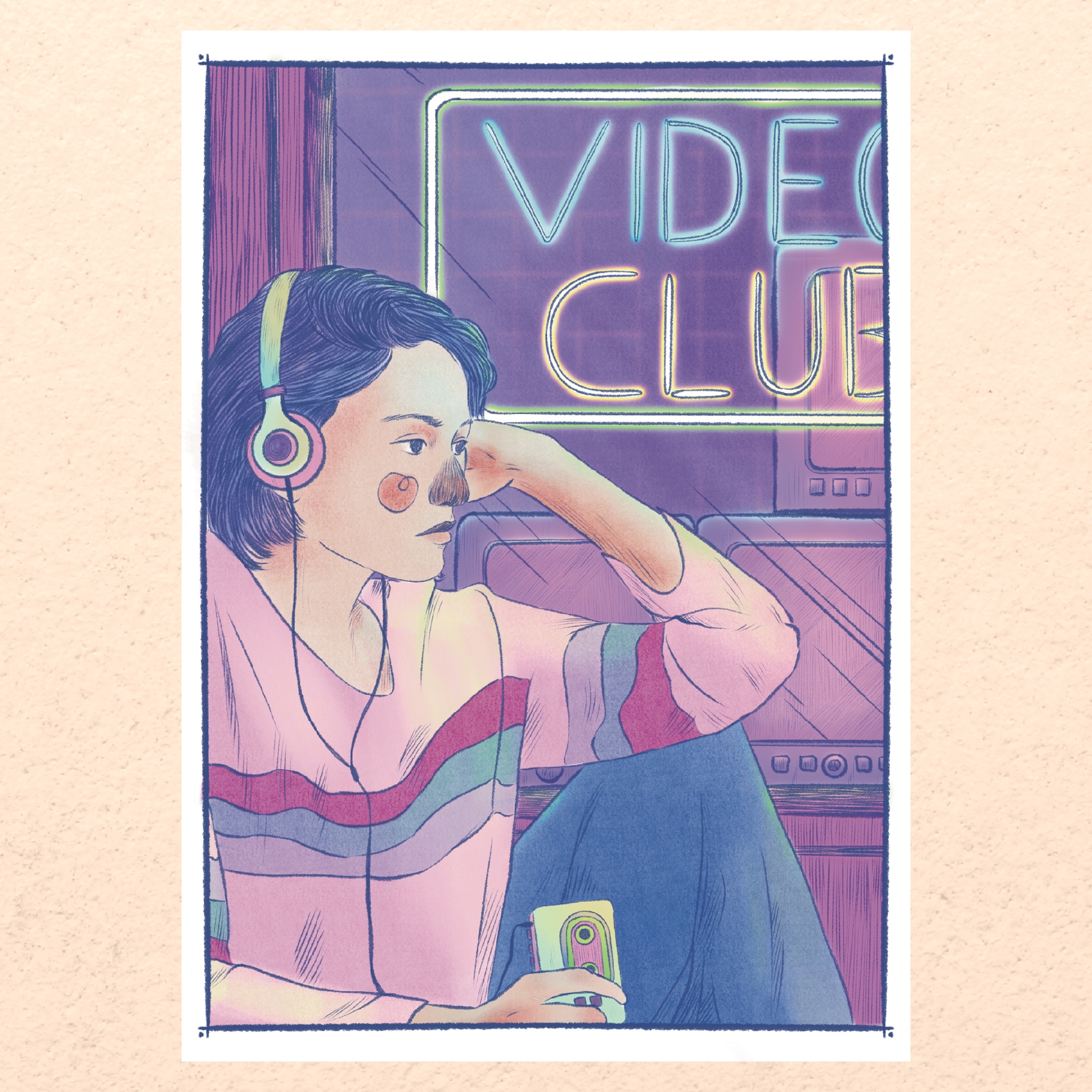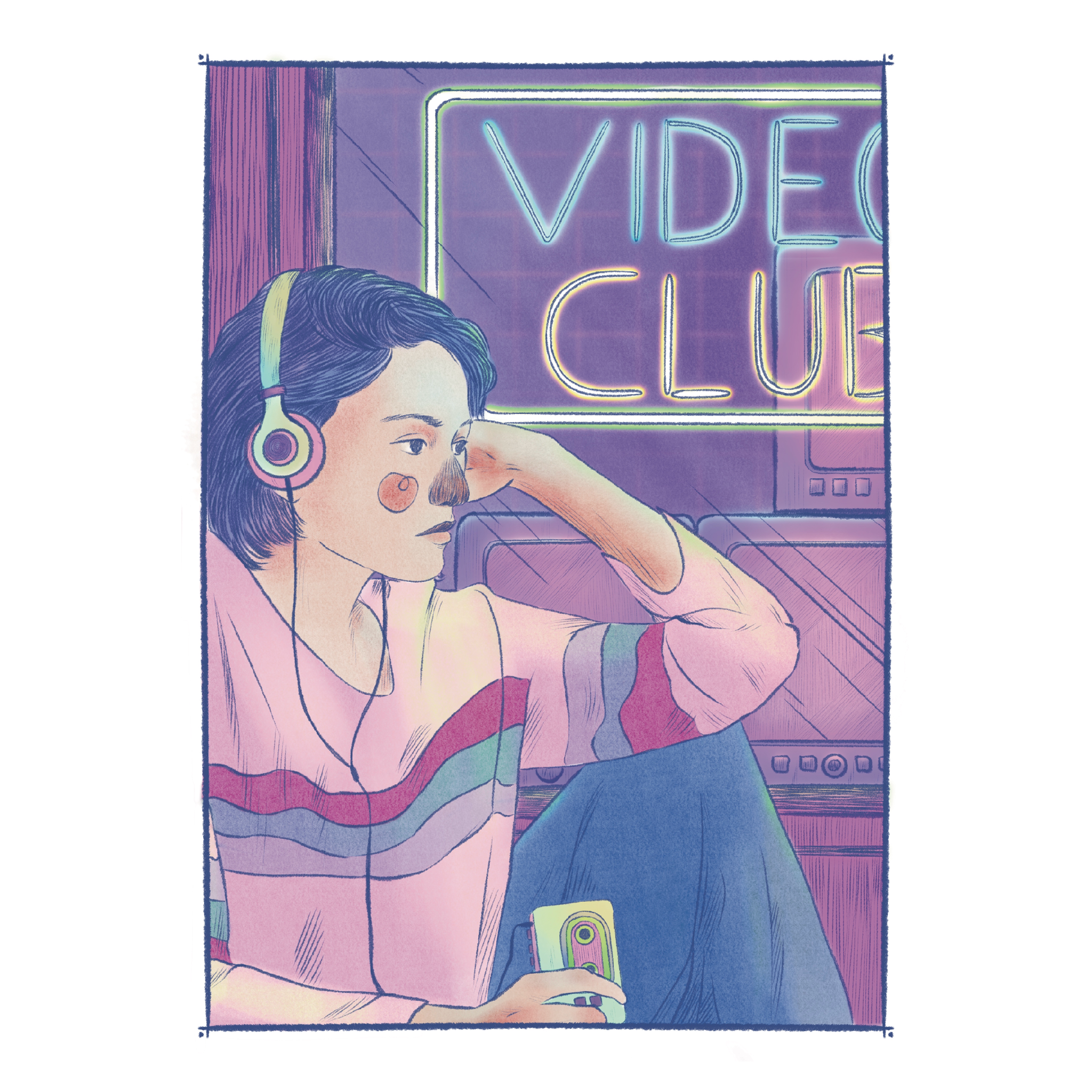 illustration à l’ambiance années 90’s pour revenir à notre enfance. Une jeune femme se laisse bercer au son de son lecteur de cassettes, devant un vidéo Club, avant une soirée ciné en famille!