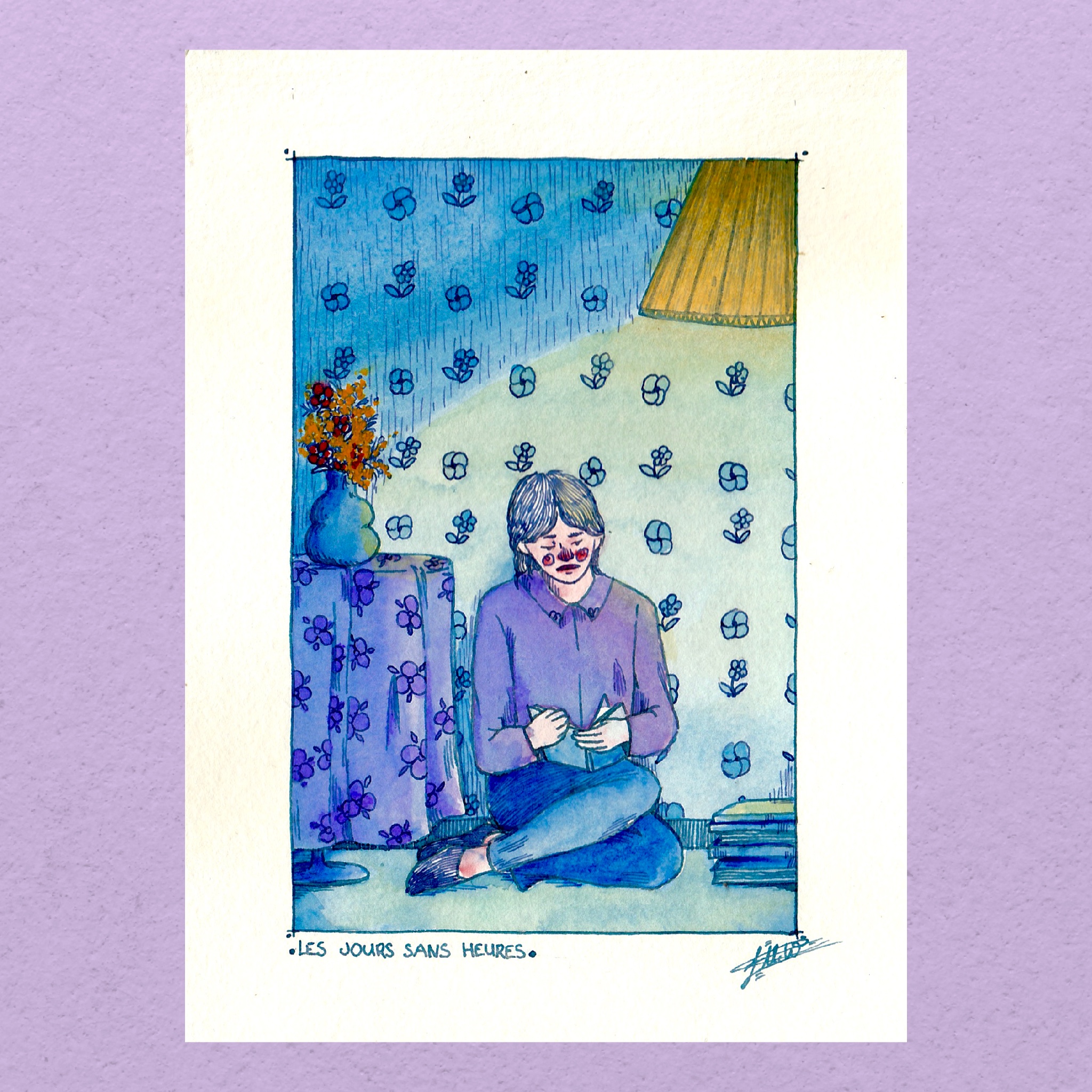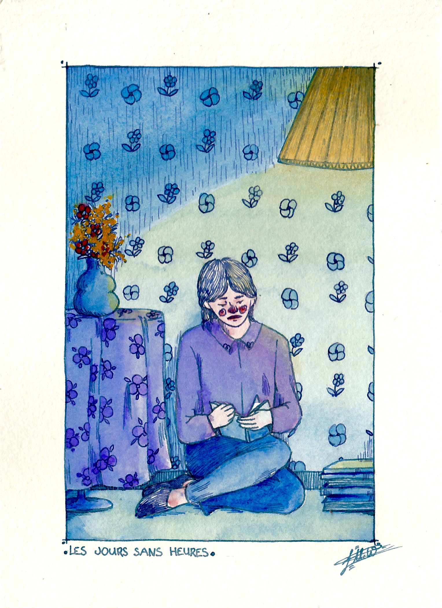 L’illustration originale : les jours sans heures est une Illustration de 13 par 18 cm. Les jours sans heures a été réalisée à l’aquarelle et à l’encre bleue. Elle est peinte sur du papier aquarelle en 300g/m2.