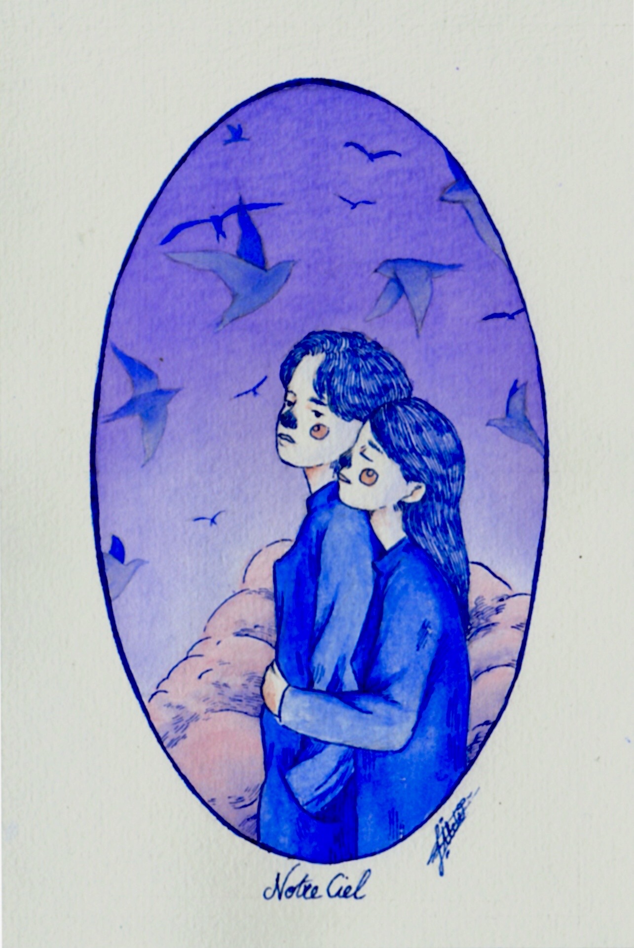 Elle représente un instant privilégié dans un couple, entouré d’oiseaux, dans un ciel aux couleurs pastels.