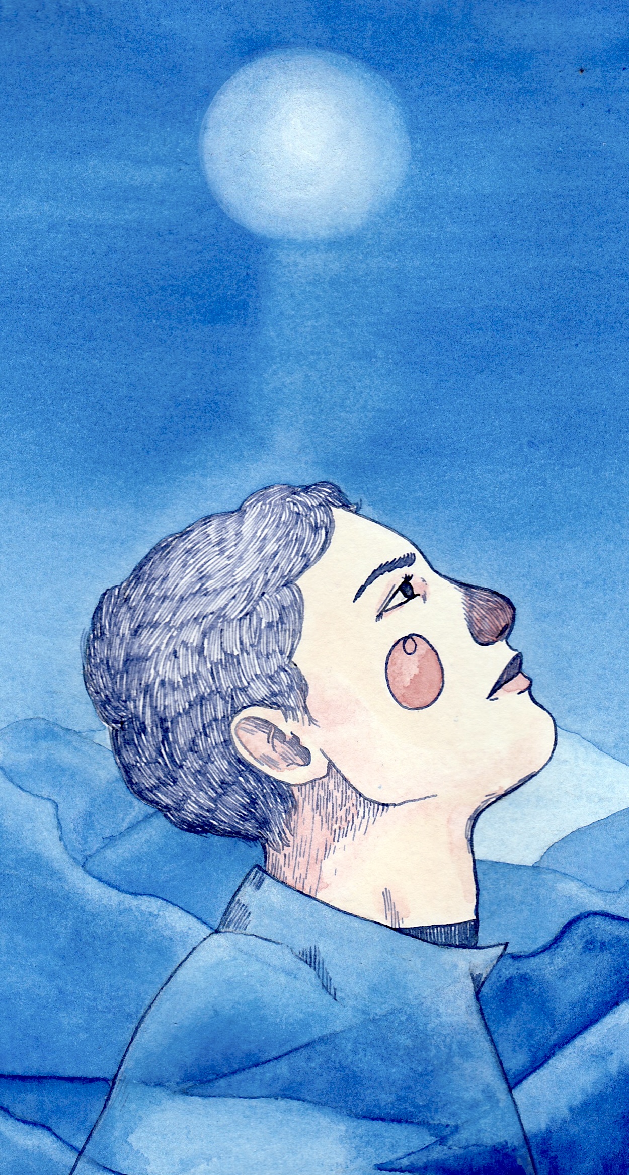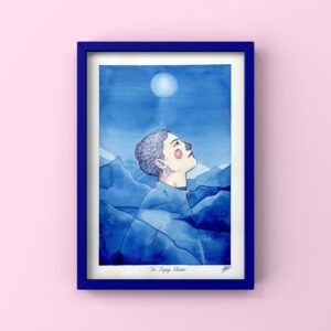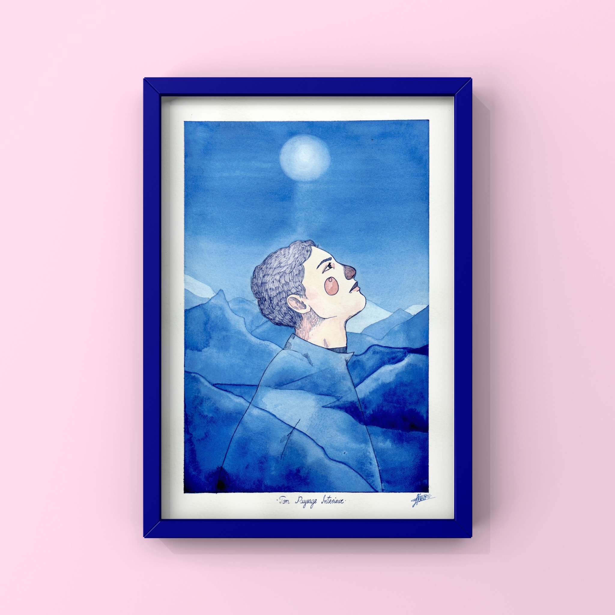 L’illustration originale représente le portrait d’un personnage au travers duquel on aperçoit ses émotions qui créent un paysage mystique . Ton paysage intérieur a une dominante bleue, représentant la douceur, l’apaisement et la stabilité . Le paysage montagneux représente le long voyage effectué pour atteindre cette stabilité et ce calme.