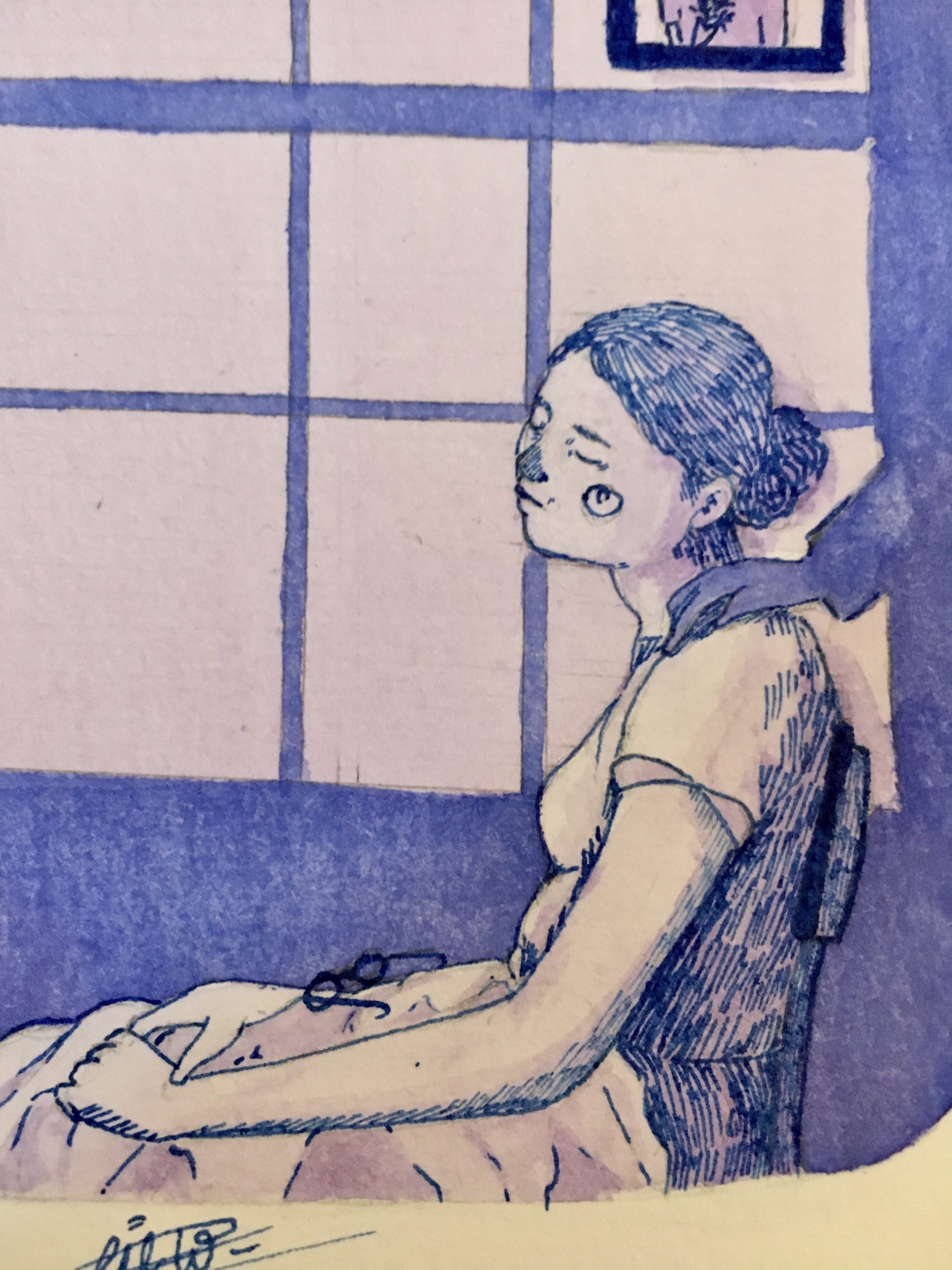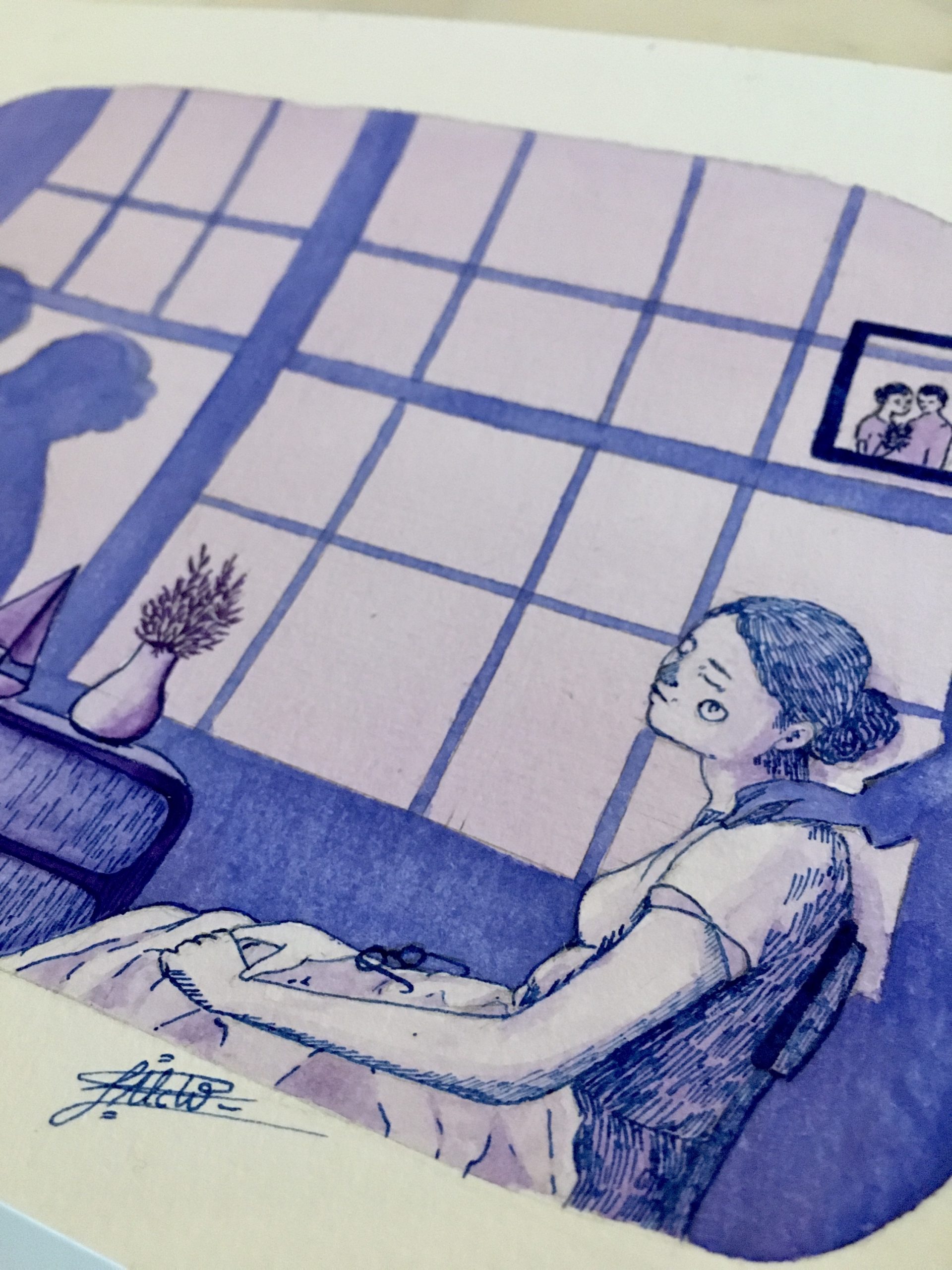 Elle a été crée à l’Aquarelle et à l’encre sur du papier aquarelle en 310g/m2.