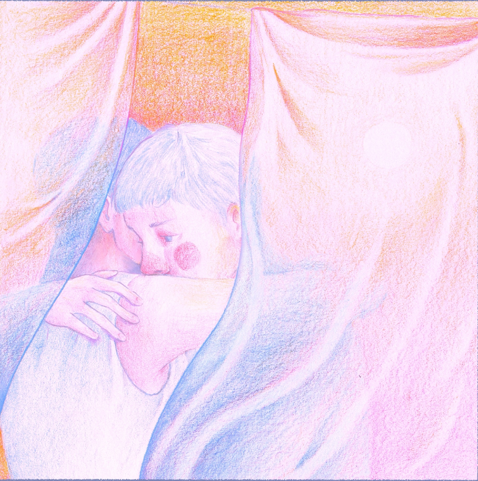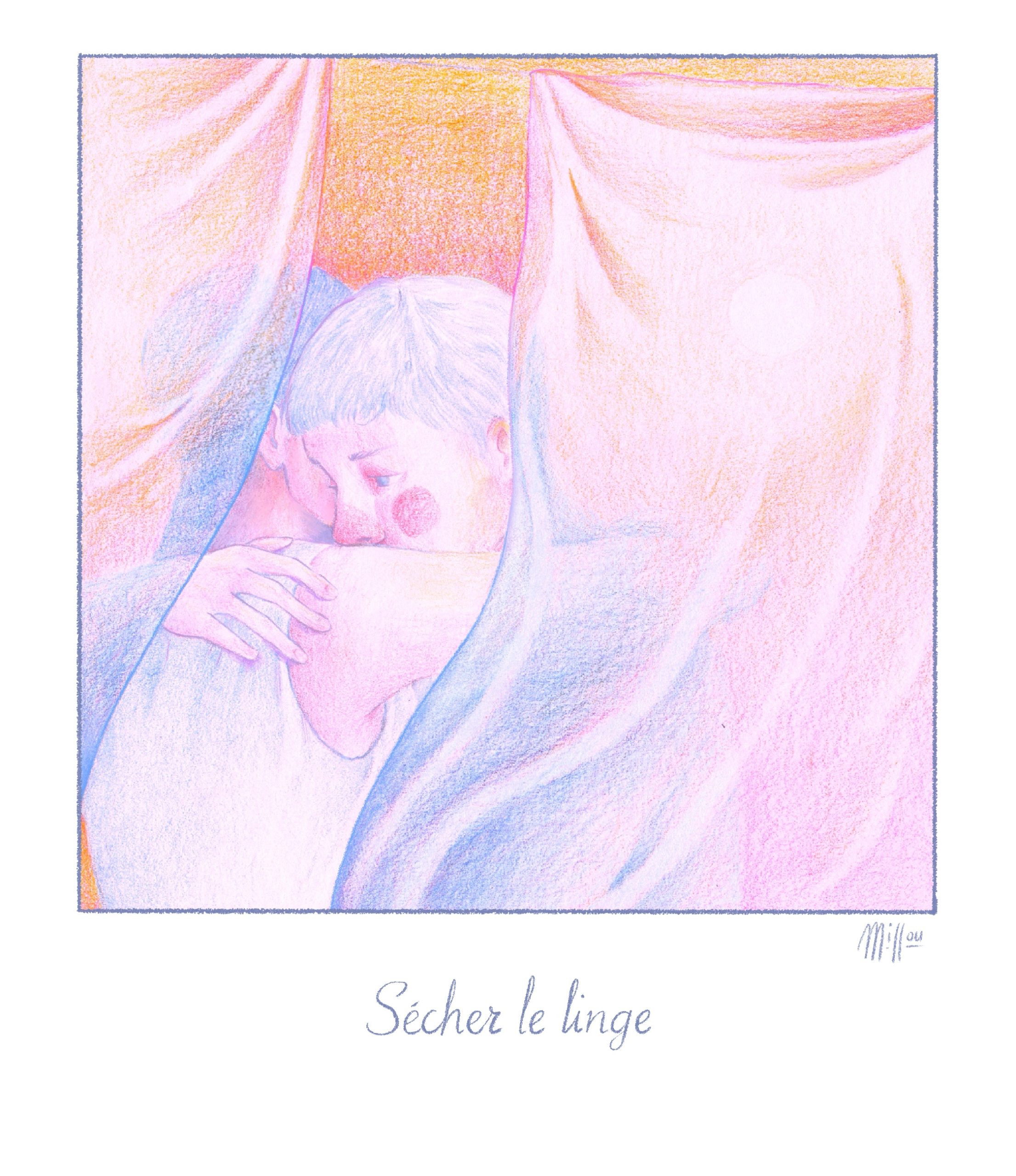 « Sécher le linge » est une illustration numérique qui capte un moment intime et poétique, où la lumière douce du jour effleure les draps suspendus. La scène, baignée dans des tons pastels de rose, bleu et jaune, représente une figure paisible, enveloppée par la chaleur des tissus, évoquant un instant de calme et de réconfort. Cette œuvre invite à la contemplation et à l’introspection à travers sa palette de couleurs tendres et son atmosphère feutrée.