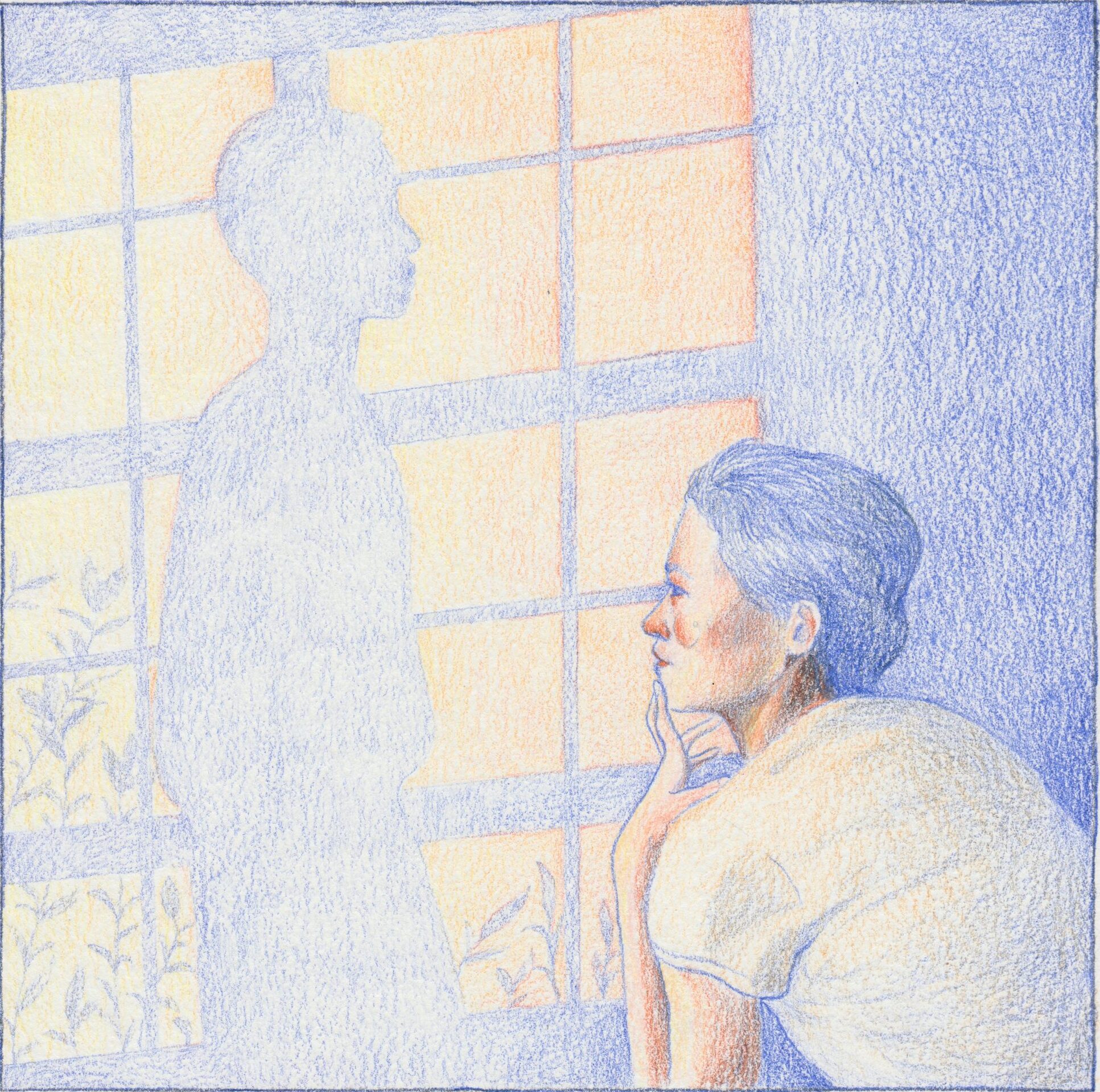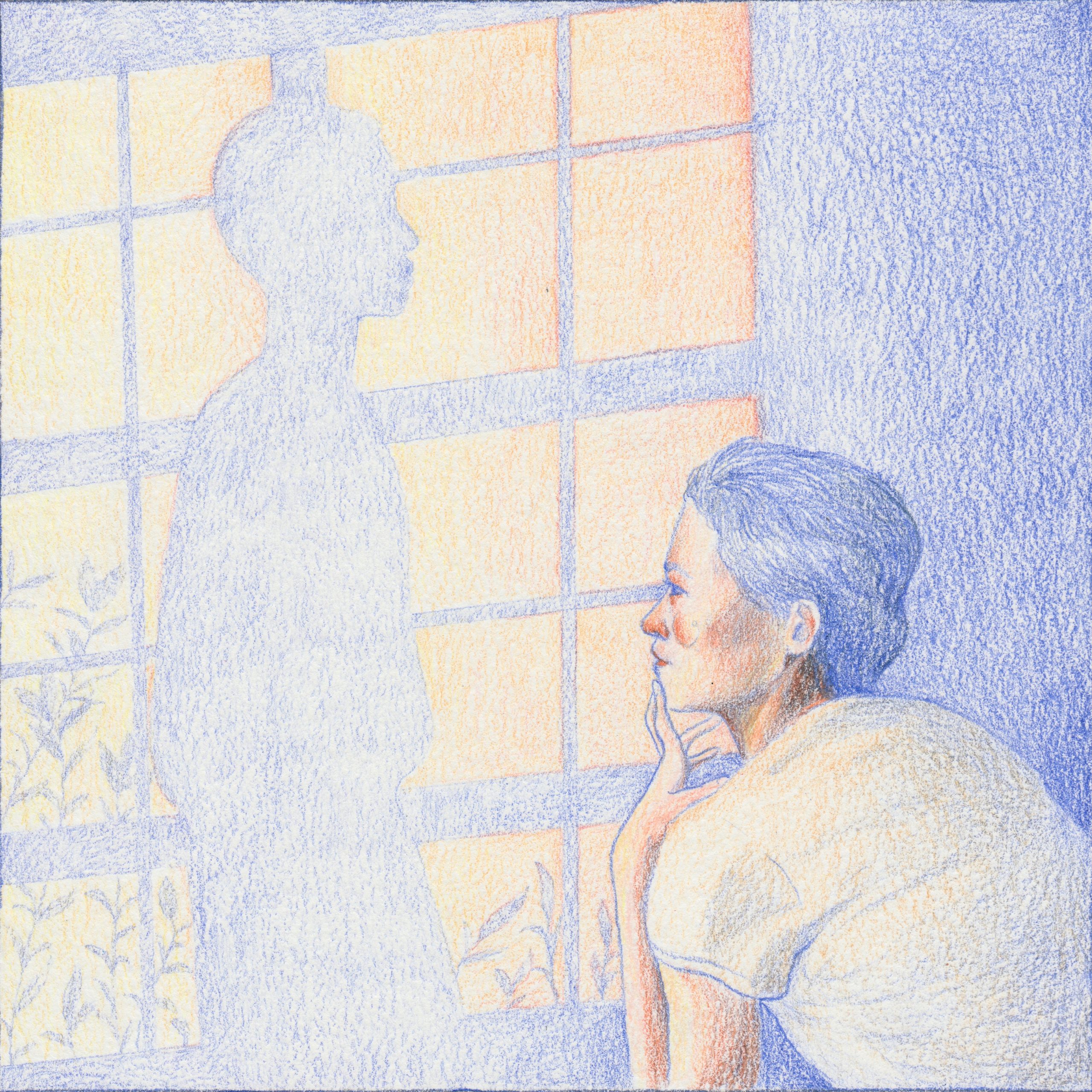 L’illustration dépeint une femme contemplant l’ombre de son être cher projetée sur le mur, enveloppée dans les teintes chaudes et vibrantes du coucher de soleil. Chaque détail est minutieusement travaillé pour capturer l’essence romantique et mélancolique de ce moment précieux.