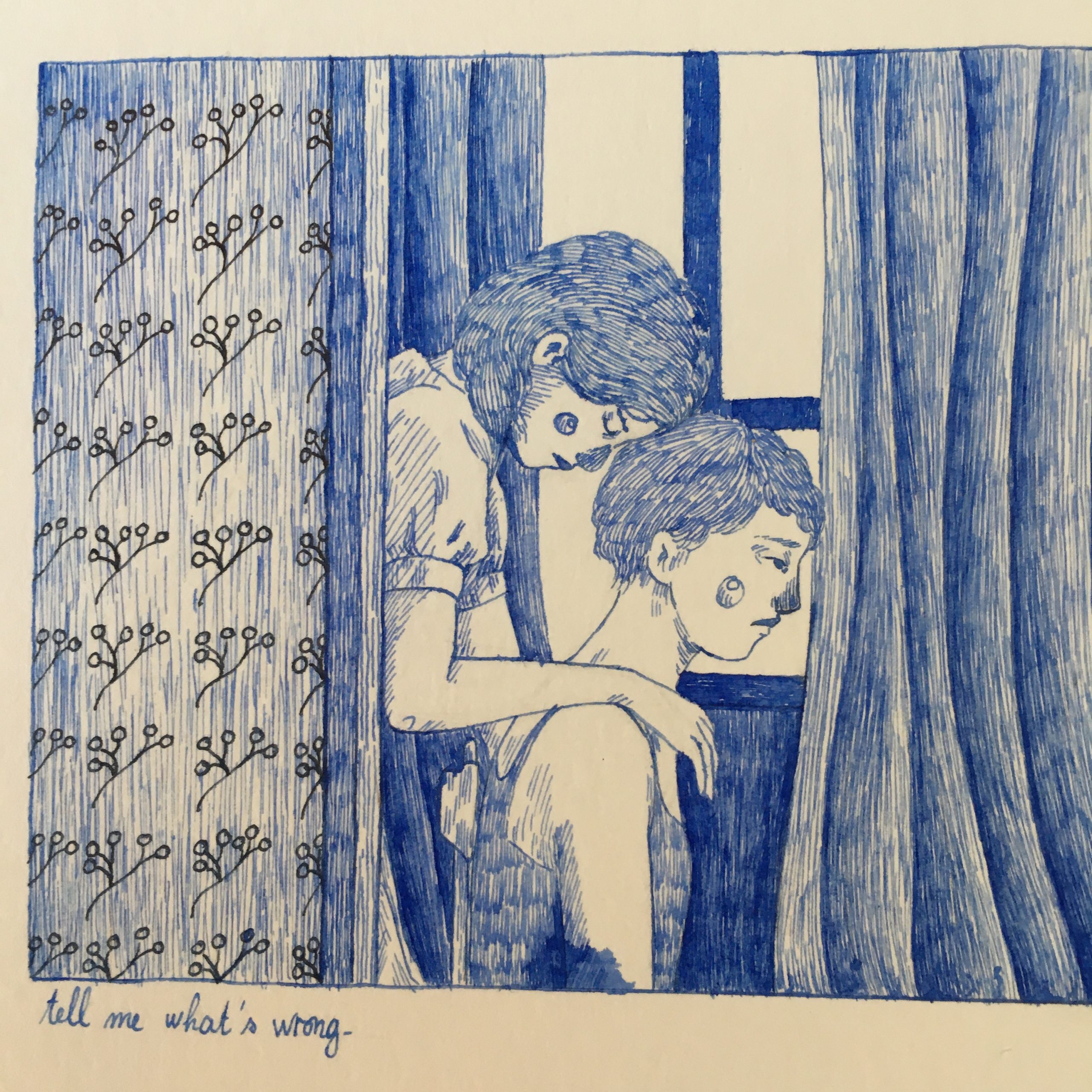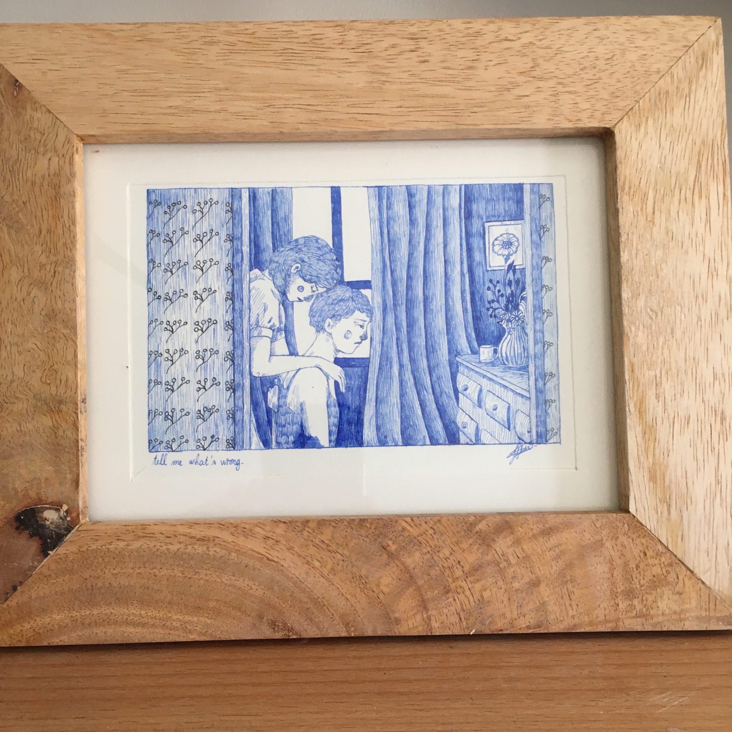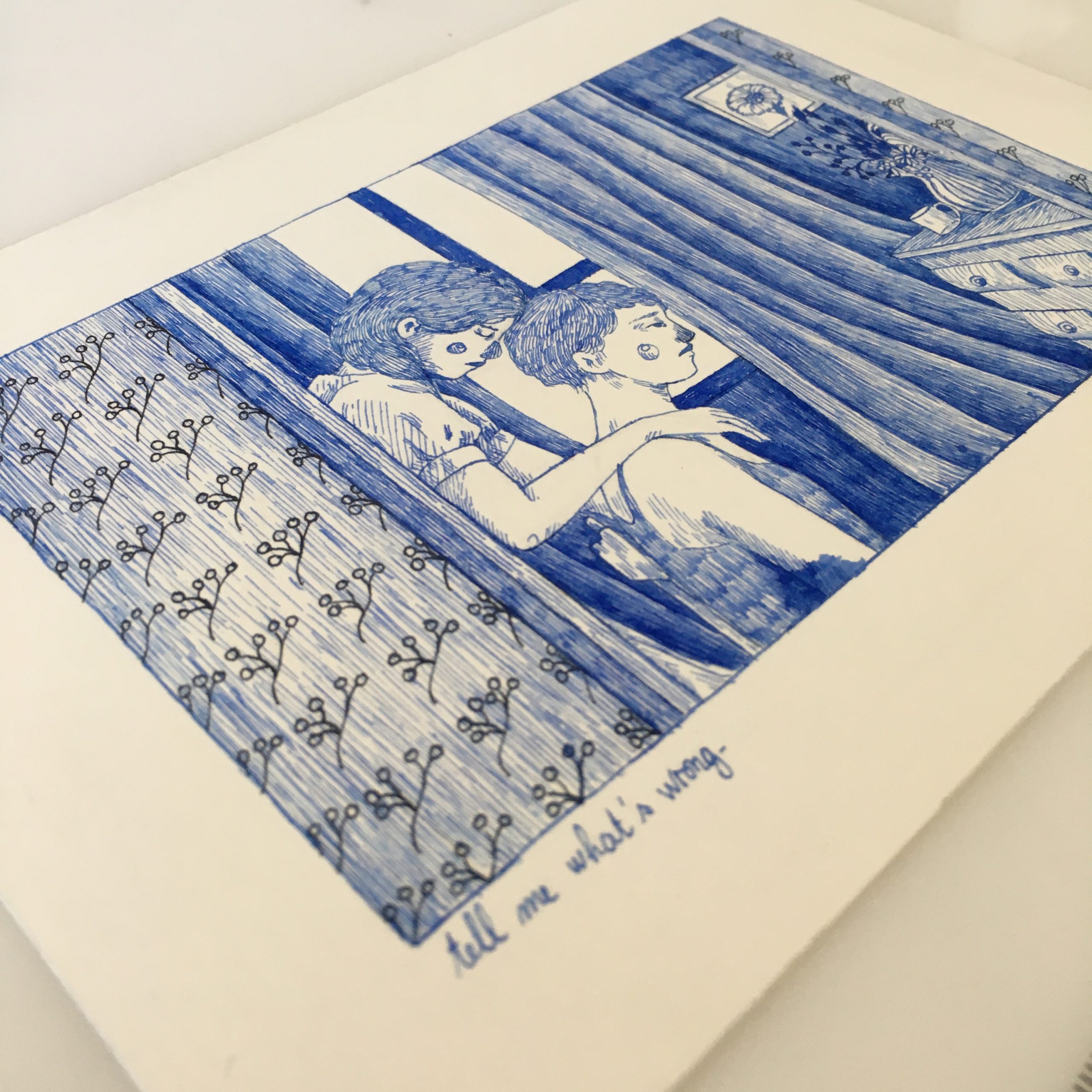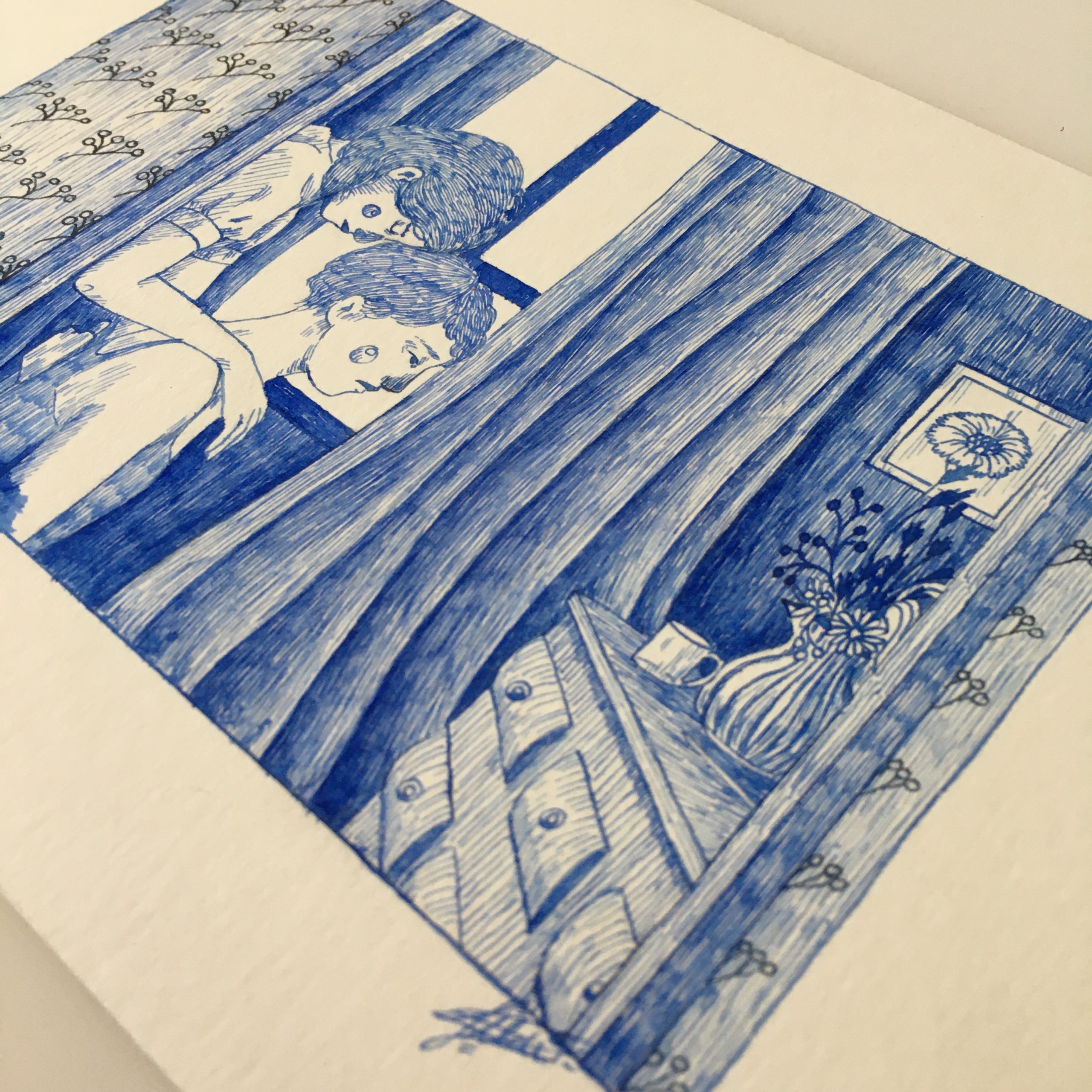 Illustration faite main, sur papier aquarelle 310g/m2 encre bleue à la plume.